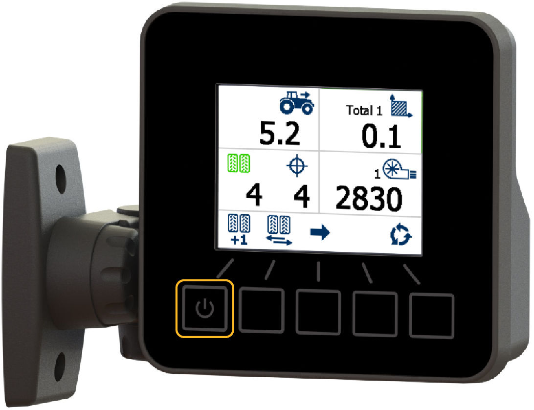The standard retrofit system gets power from a 3-pin tractor implement power socket (COBO) in the tractor cab. You can set the display unit to ON or OFF with the Power button on the front panel. The display continues its previous ON or OFF status when you disconnect and reconnect the COBO connector.