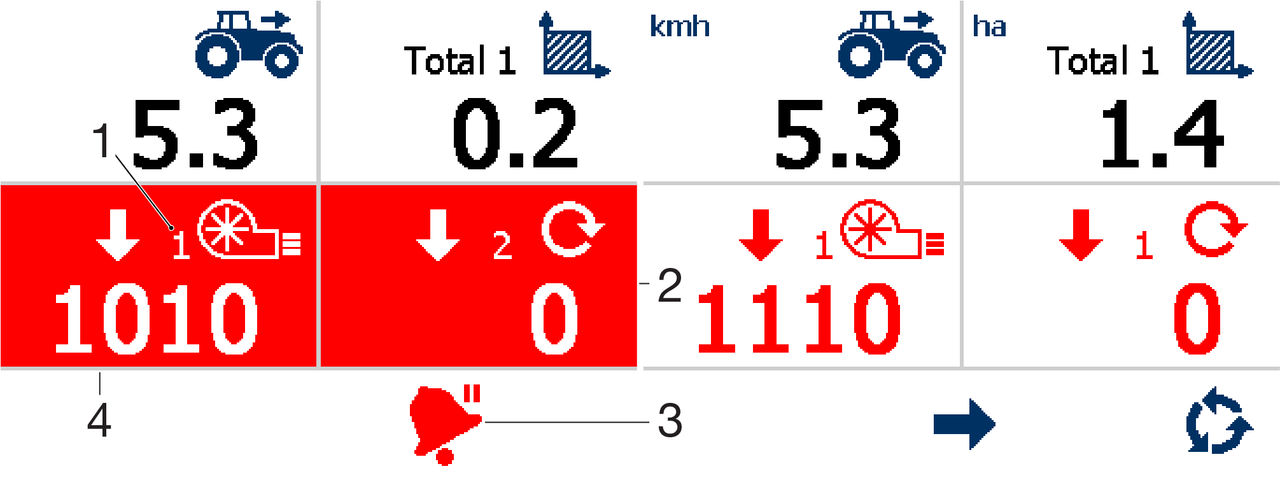 The display can monitor either one or two fans and one or two metering shafts. This is controlled by the drill configuration. A fan alarm has a low-speed and a high-speed configurable threshold. A metering shaft alarm has a low-speed alarm threshold with a configurable time delay before activation. You can configure the time delays from the Operator menu. If a fan and/or shaft speed goes above (or below) the thresholds, an alarm window replaces the tramline window and flashes red, then the display makes five alert sounds. Select