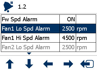 - Use the left/right arrows to set an alarm threshold.ADDITIONAL INFORMATION:Note:If a fan speed calibration factor (PPR) is set to zero, the corresponding alarm setting is not available.