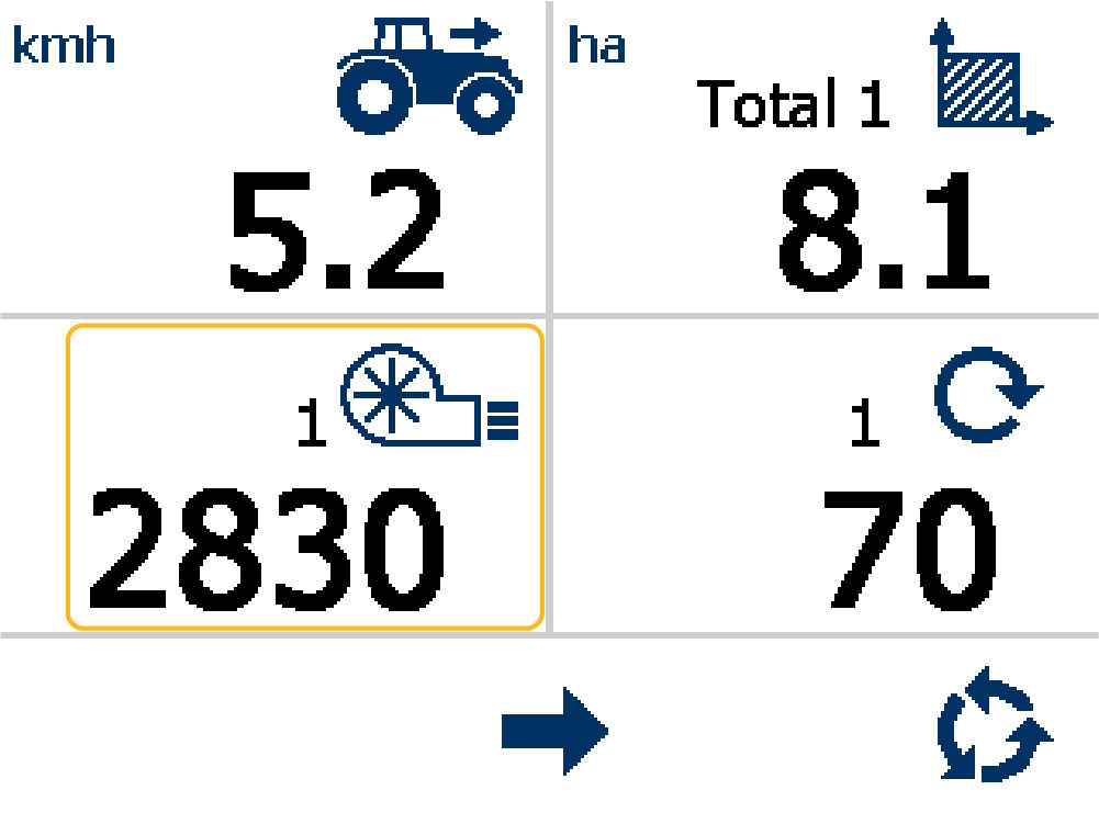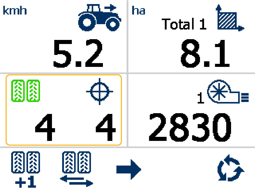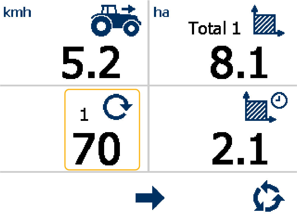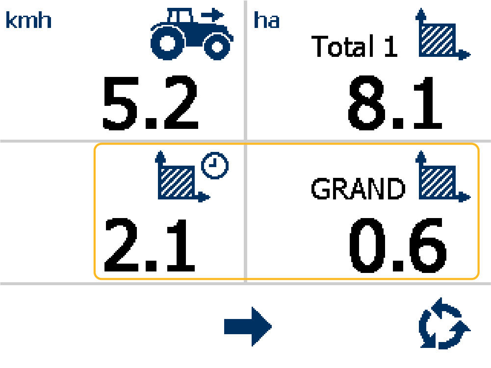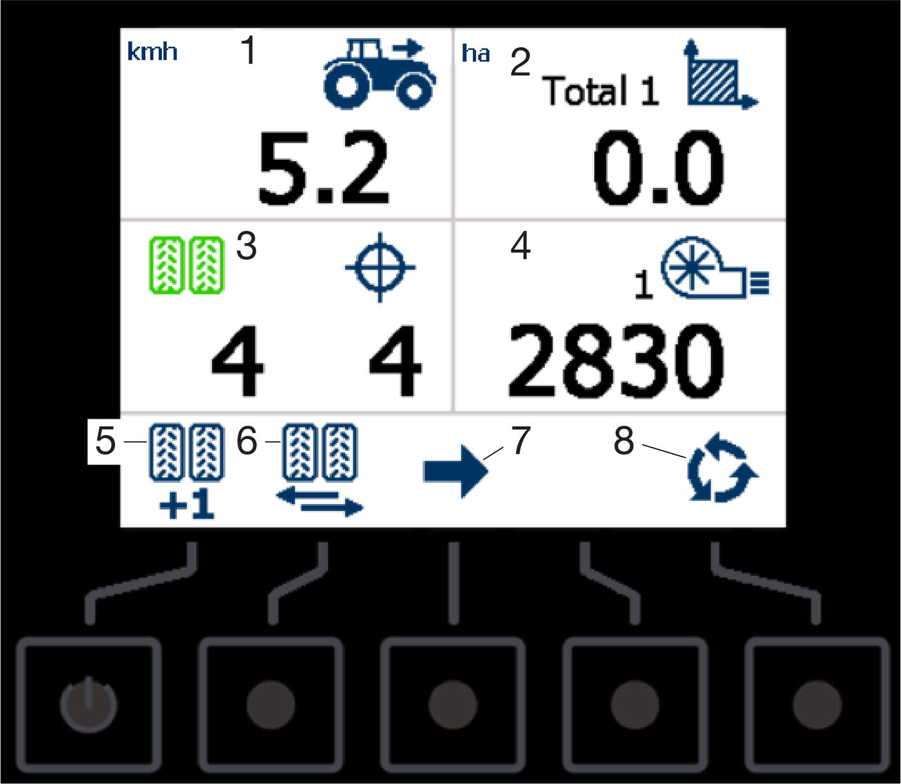 The Forward Speed pane (1) and Total Area pane (2) permanently show. Four buttons on the display have specified functions.