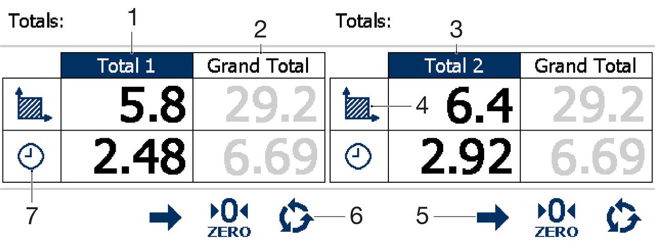 to the total that is selected on the display (Total 1 or Total 2). The system only adds Area while the drill is in work. The system also adds Area and Work Time to the Grand Total memory register. Select