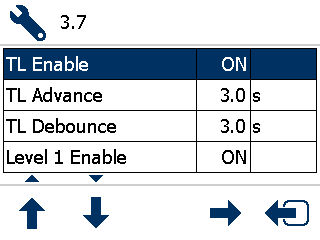Learn how to enable or disable tramlining from the Technician menu and adjust settings with the arrow controls.