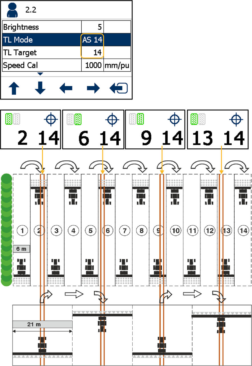 Supplies information about a fourteen-bout tramlining rhythm with specific seed spout closures. This includes adjustments for field edge orientation.