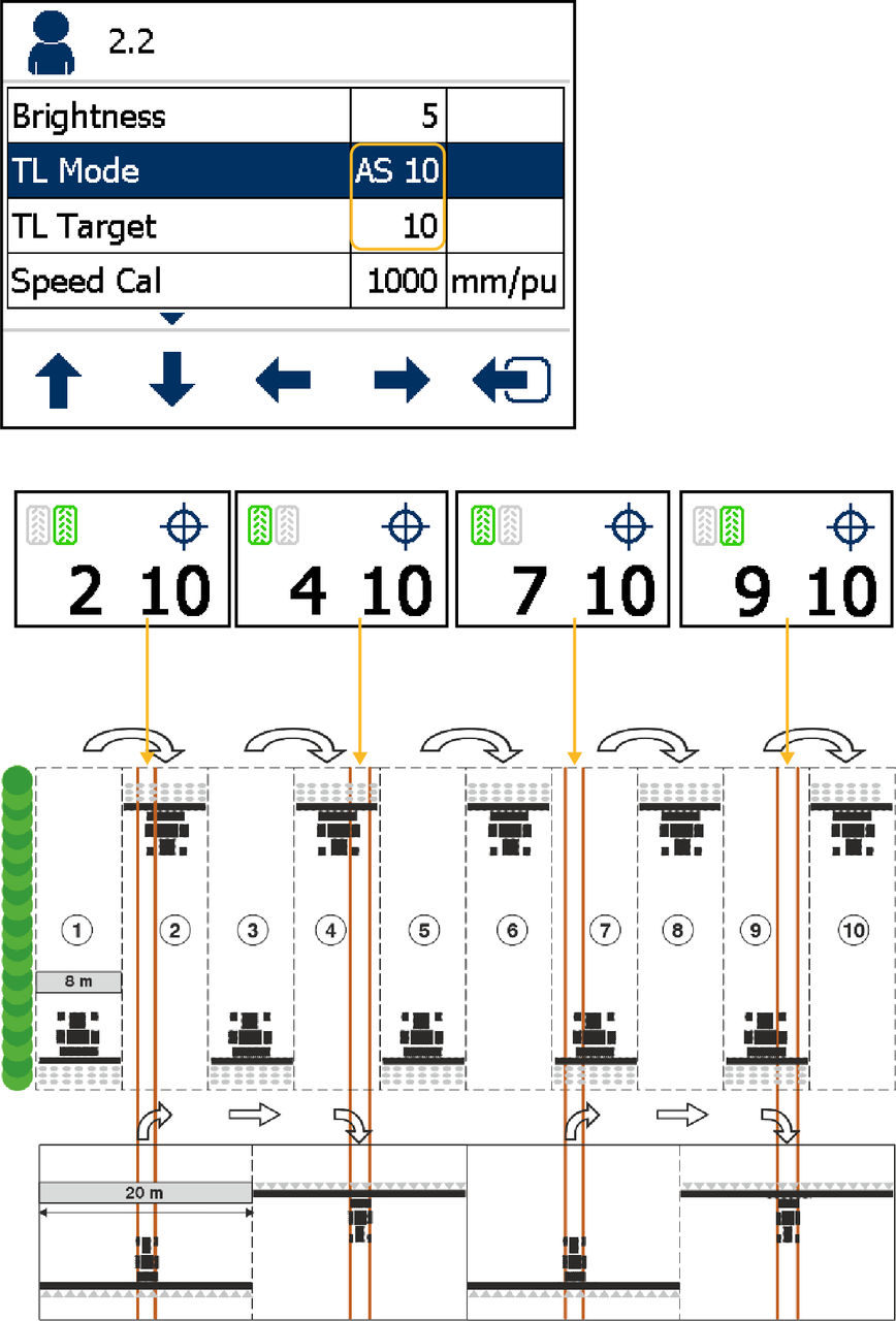 Use this rhythm with 4 m drill/10 m sprayer, 6 m drill/15 m sprayer, 8 m drill/20 m sprayer combinations (2x2 left side seed spouts are closed on bouts 4 and 7, and 2x2 right side seed spouts closed on bouts 2 and 9).