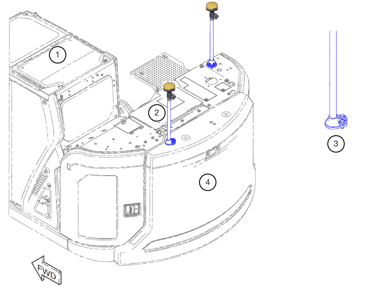 CAT 315 model excavators include predrilled holes for use with the antenna mast mounts.