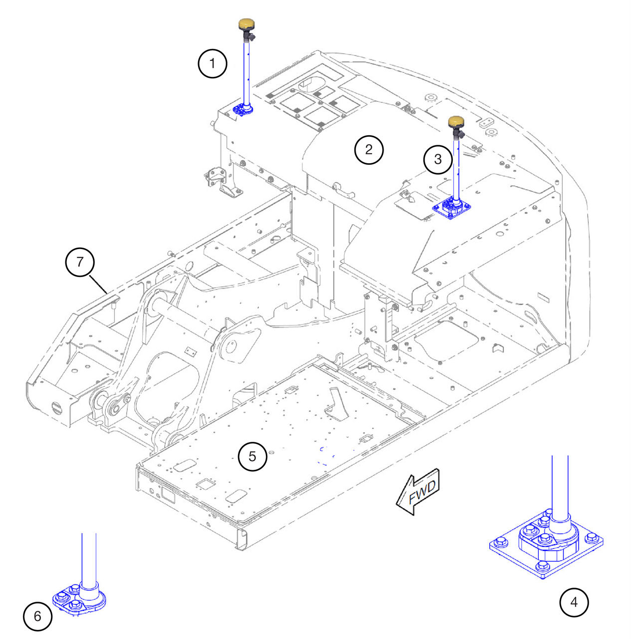CAT 317 model excavators include predrilled holes for use with one antenna mast mount. See the detail view of Area A. You can order an additional welding plate for easier installation. See the detail view of Area B. Contact your local CAT dealer for more information.Figure: CAT model 317 antenna mast mount and weld plate