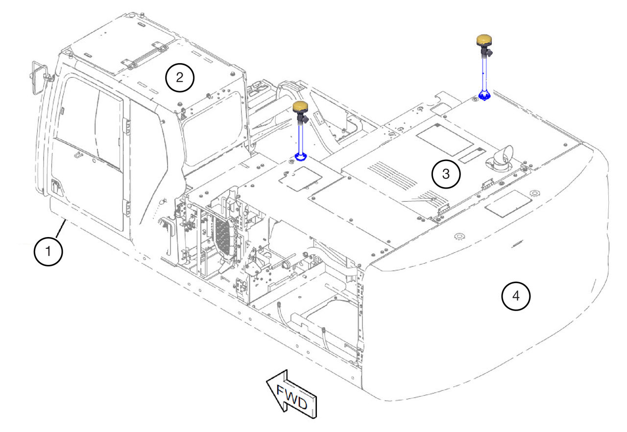CAT 336 and 340 model excavators include predrilled holes for use with the antenna mast mounts.