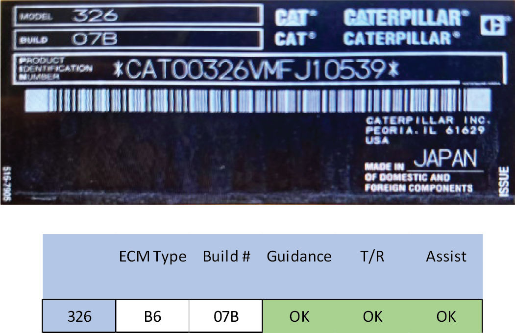 The serial tag displays both the model and build indicator to identify the type of ECM. For example, the 326 model with B6 ECM is capable of performing 3D indicate, 3D Automatic, and supports a tilting rotator. See the table in the Supported Machine Models - APU 2022 topic.Figure: Serial tag