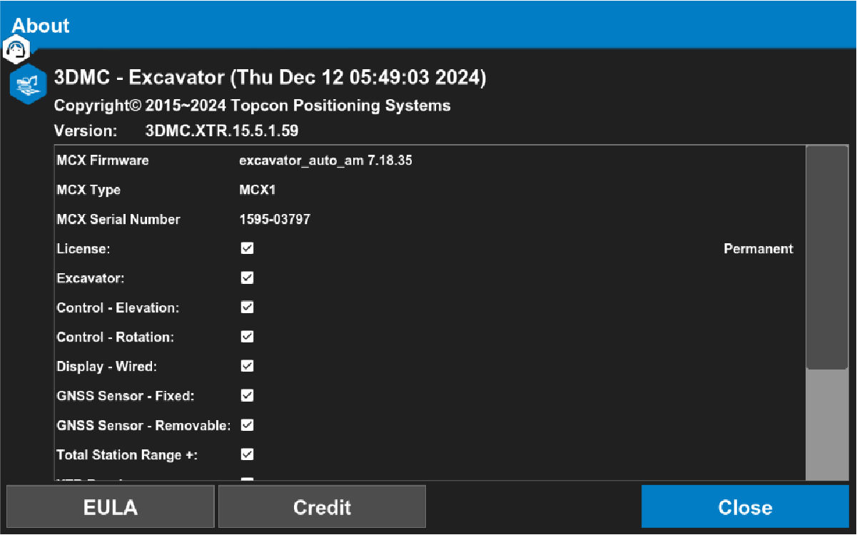 With 3D-MC running, system information is available on the About page on the 3D-MC version, the MC-X1 firmware, the MC-X1 serial number and the activated license modules on the device.