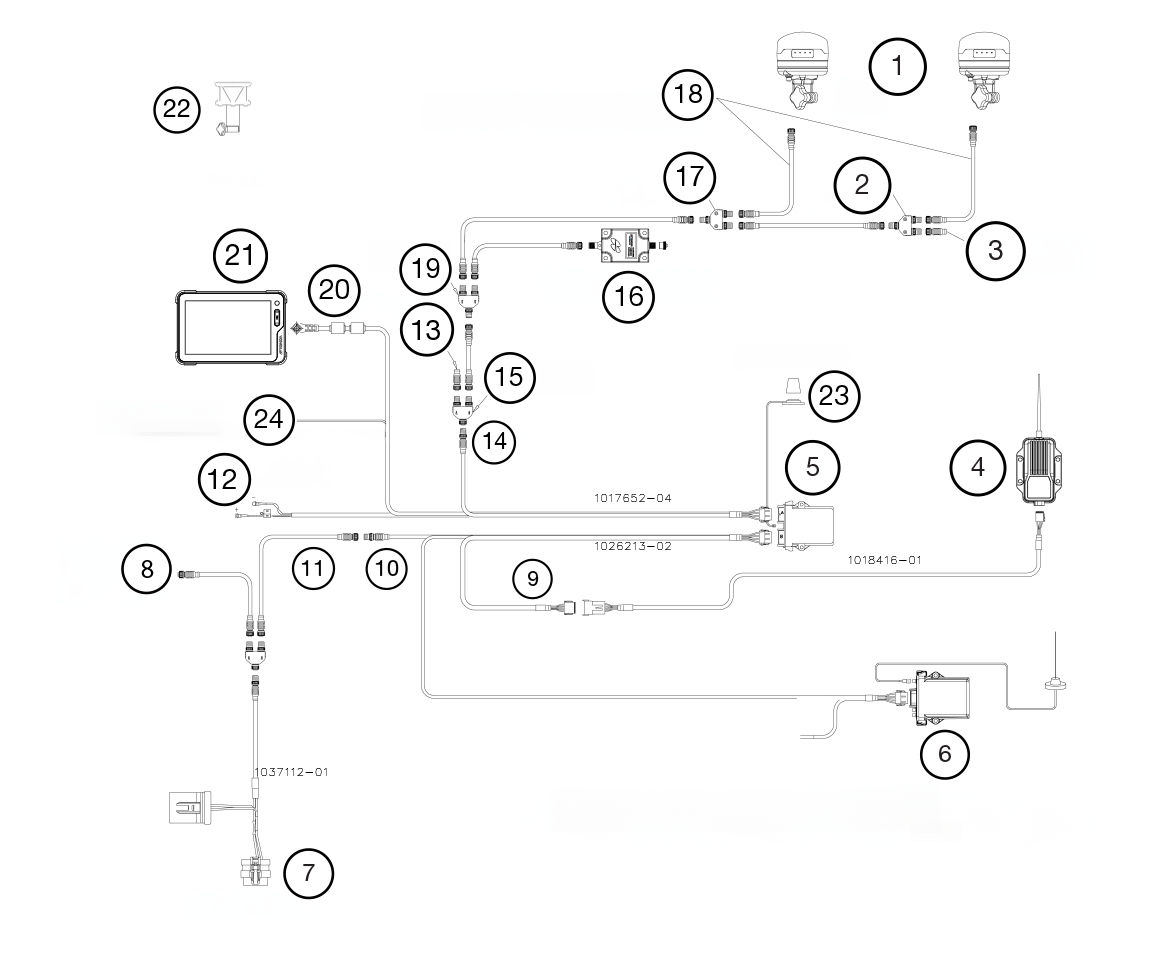 The CAT TRS tilt rotator receives rotation information from the CAT CAN through the P/N 1037112-01, ASSY, CAT BUILD Grade Control XTR P/CAN ADPTR CBL. Thus, it is not necessary to connect directly to the Topcon P/N 1026213-02, ASSY, MC-X1 BREAKOUT B W/SL-25 harness CAN2 (J1939) connector.