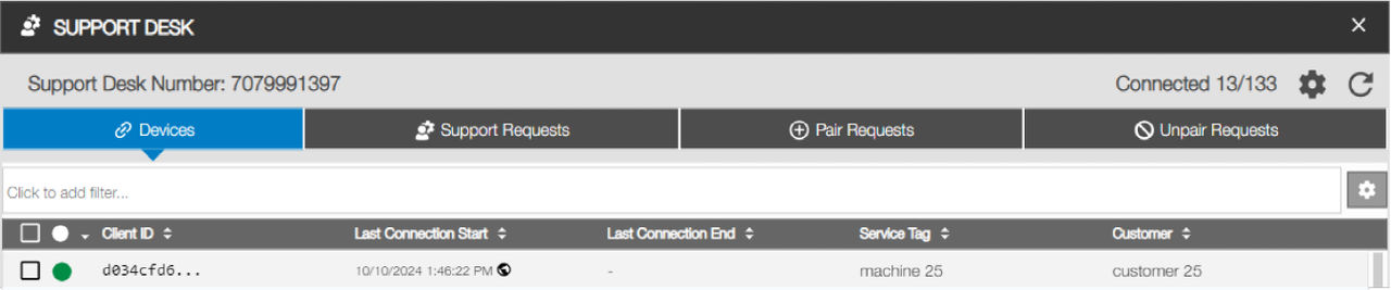 The user can view support desk information, such as the support desk name and contact phone number. The user can also enter a customer name and service tag for easy identification on the Sitelink web portal support desk.Figure: Support desk