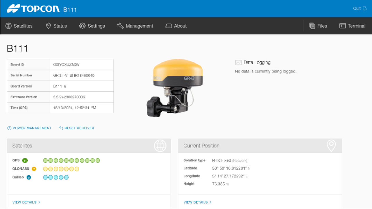 The GNSS receiver has either the B111 or B111A board. The specific GNSS and Bootloader firmware must be uploaded. The board information is available when connected to the main or aux receiver using the Receiver Web Portal (R-WEB).