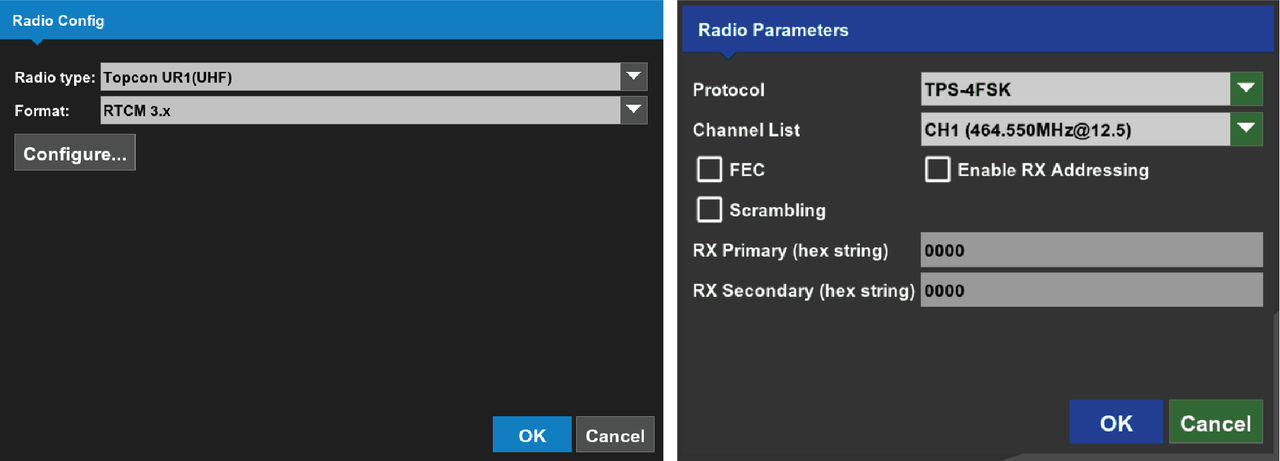 - For Topcon UR1 (UHF), select the applicable settings for Protocol, Channel List, FEC (Forward Error Correction), and Scrambling. The channel setting must align with the base station channel setting.ADDITIONAL INFORMATION: