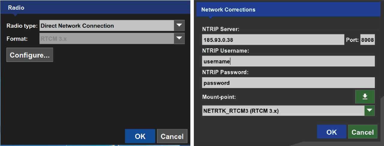 - Input the NTRIP Server, NTRIP Username, and NTRIP Password from your network connection service provider.